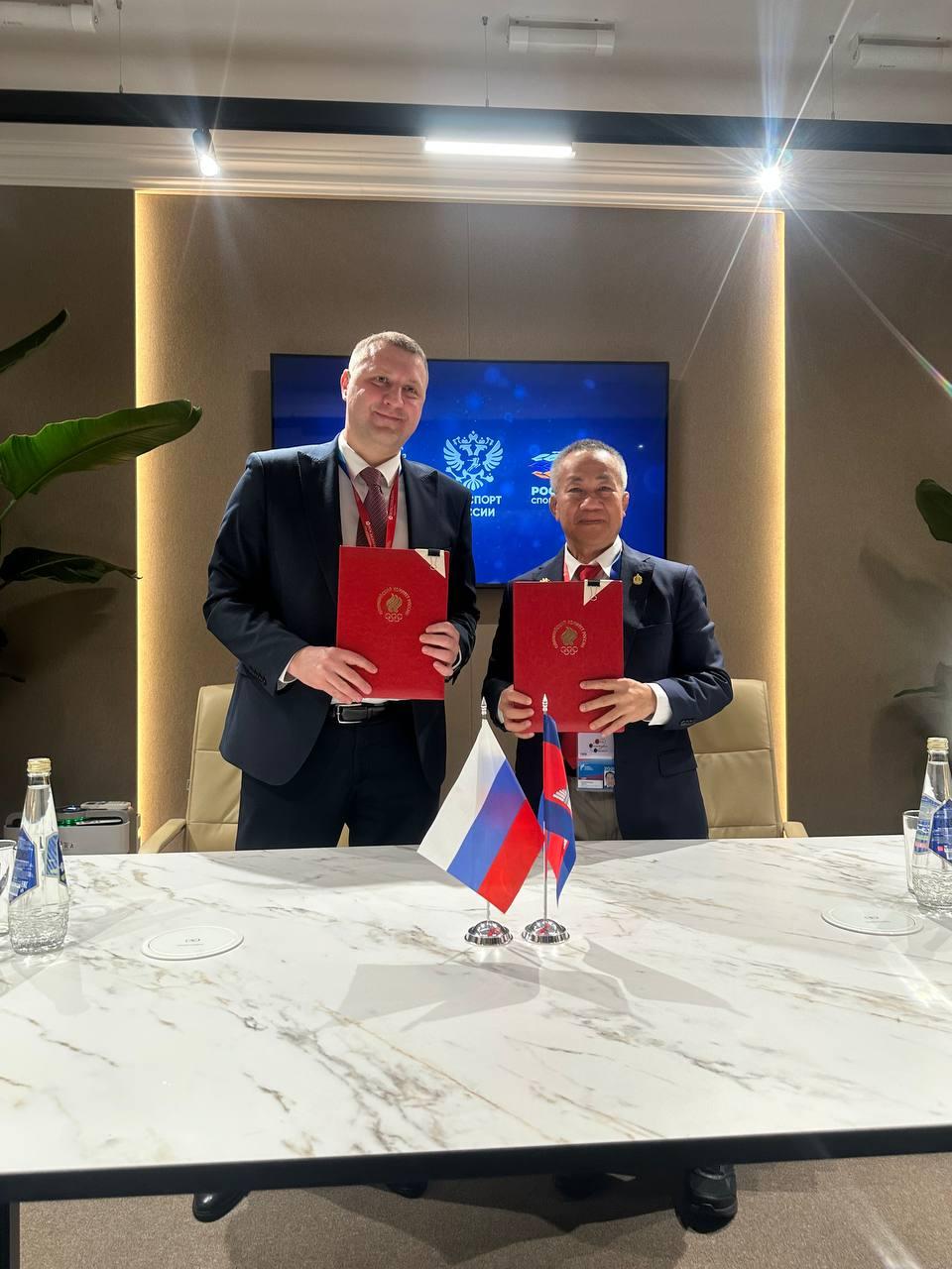 With the permission of H.E. Dr. Senior Minister Thong Khon, President of the National Olympic Committee of Cambodia, and H.E. Vath Chamroeun, Secretary General of the National Olympic Committee of Cambodia, signed a Memorandum of Understanding (MoU) between the National Olympic Committees of the two countries on November 5, 2025 in Samara City, Russia.