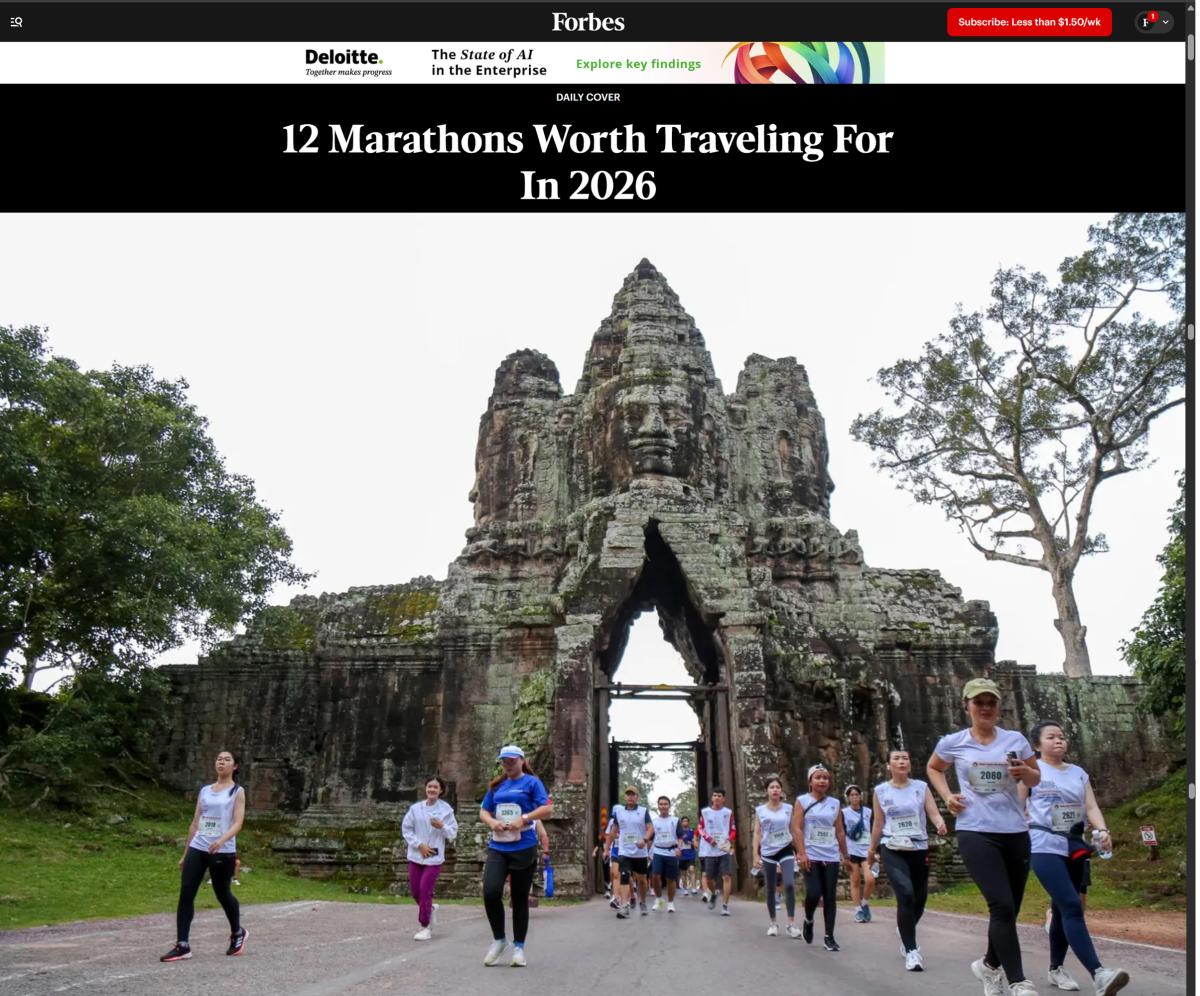 ទិវារត់ប្រណាំងម៉ារ៉ាតុងចក្រភពអង្គរ ឬ Angkor Empire Marathon ដ៏ធំរបស់កម្ពុជាត្រូវបានទស្សនាវដ្ដី Forbes ដ៏ល្បីល្បាញលោកជ្រើសរើសជាគោលដៅដ៏ទាក់ទាញបំផុតក្នុងចំណោមព្រឹត្តិការណ៍ម៉ារ៉ាតុងអន្តរជាតិធំៗចំនួន១២ទូទាំងពិភពលោកប្រចាំឆ្នាំ២០២៦។